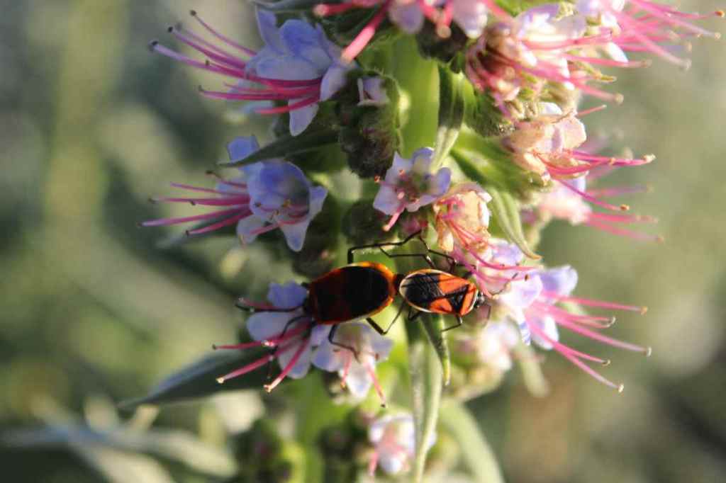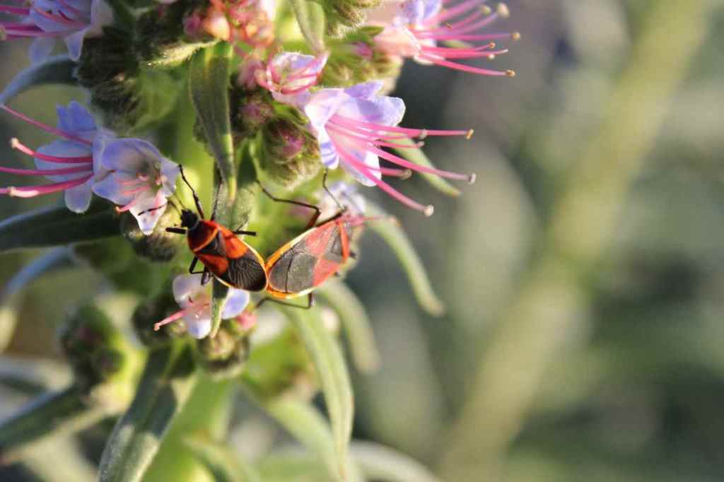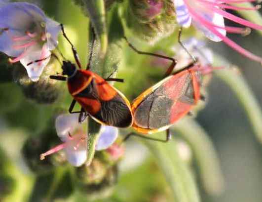 Actually, if you look closer there are two bugs. They are stuck together copulating. Apparently, the larger female drags the smaller male around. They are Harlequin bugs (Dindymus versicolour) and until today I thought they were harmless.