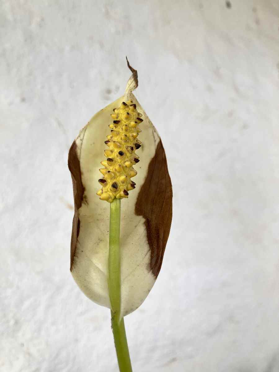 I suspect that this time I sprayed some sort of magical horticultural product on their foliage and, well, observe the result. It was supposed to feed them and promote lush growth. Maybe they’re in shock. The first was a lovely lily. It was just past its best, but sadly has been going downhill for a while. Its beautiful white flower, (only the one), developed these brown stains on both sides. I think it is still beautiful in its own way.