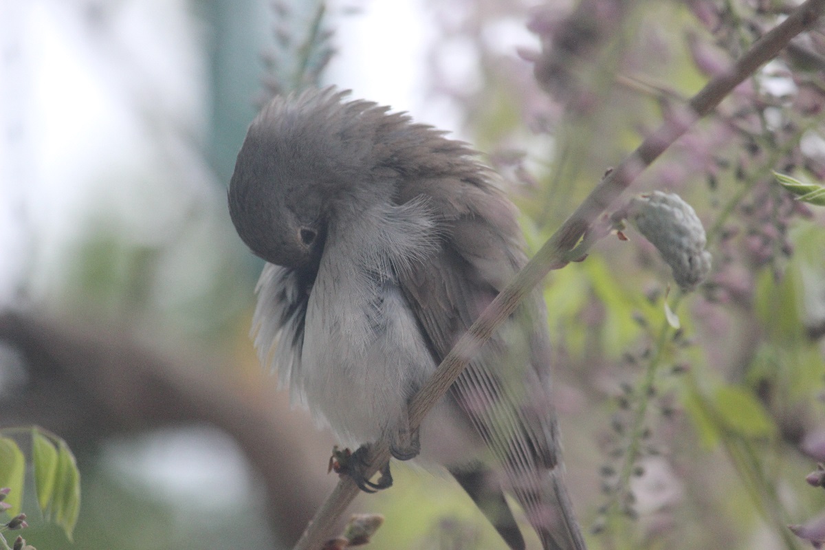 This young one is so cute. It was sitting outside my kitchen window, perched on the wisteria.