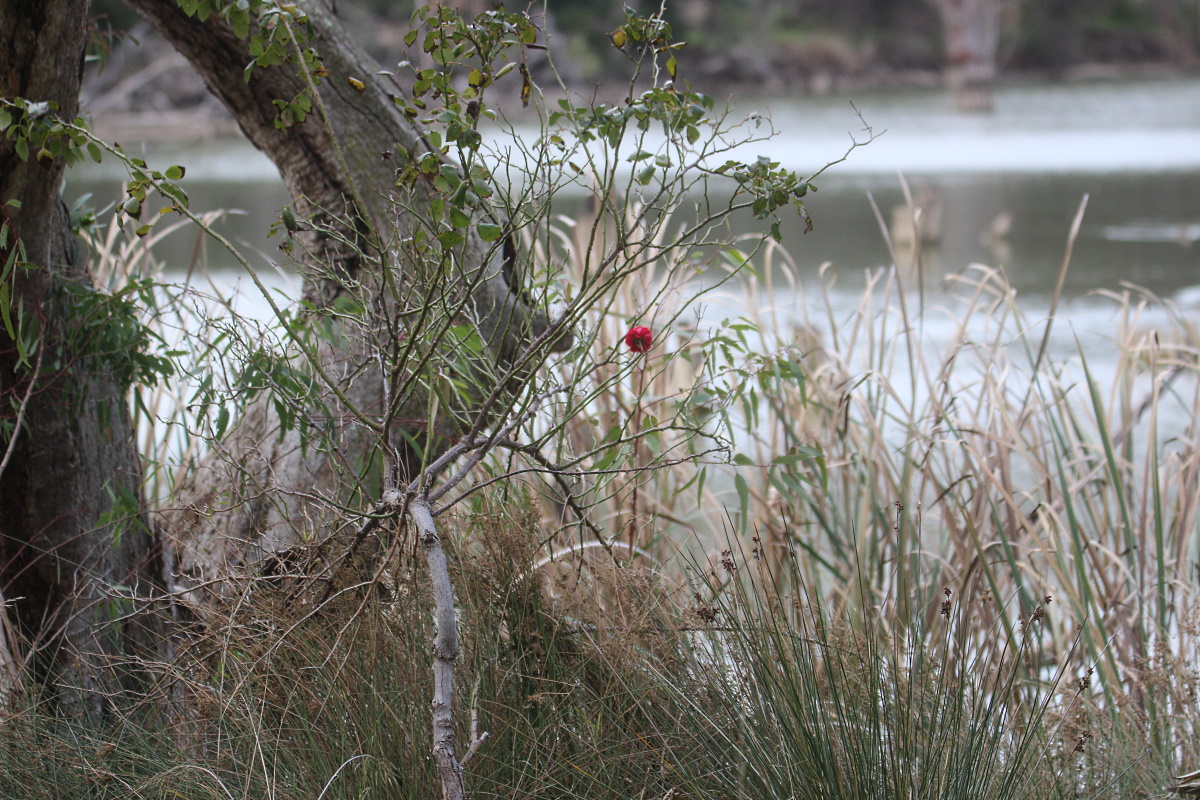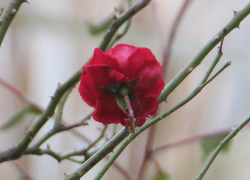 Years ago, I had a rambly rose that needed to be removed. So it was. But I couldn’t just destroy it. It was removed to the water’s edge. It stunned me as I wandered past with a single red bloom. In such depressing weather it is a ray of sunshine. I also noticed a very shy dove hiding in a tree nearby. I think it was very cold, too.