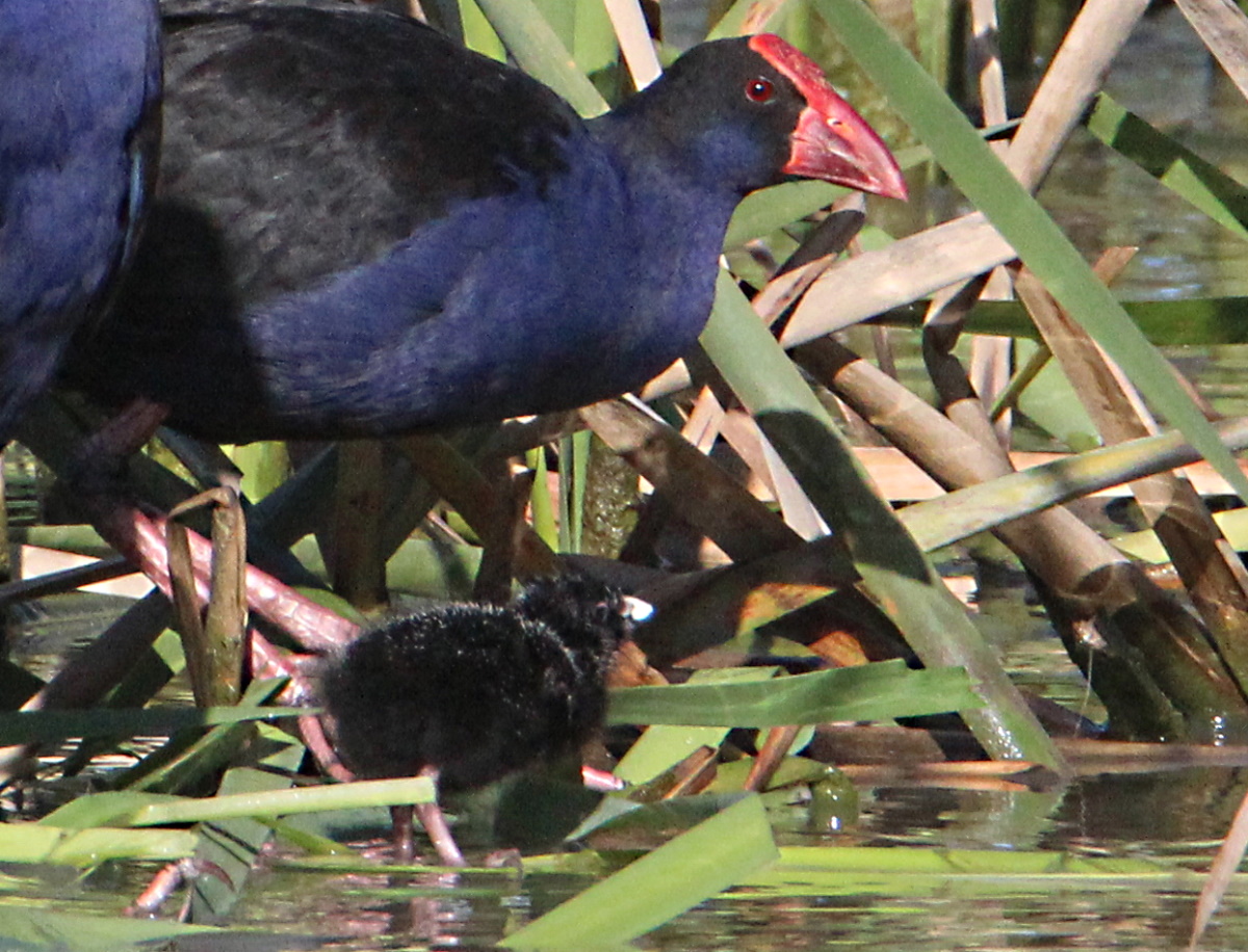 We have lots of these Purple Swamphens that wander around the farm and on the waterways. I’ve never gone looking for their nests or bothered to look for the babies. This baby is black and I found it, by accident, using the big camera lens. I thought the water hens looked lovely, so I decided to take a few snaps. It wasn’t until I focused the camera that I noticed the black shape. I waited until I could get them all into the photo.