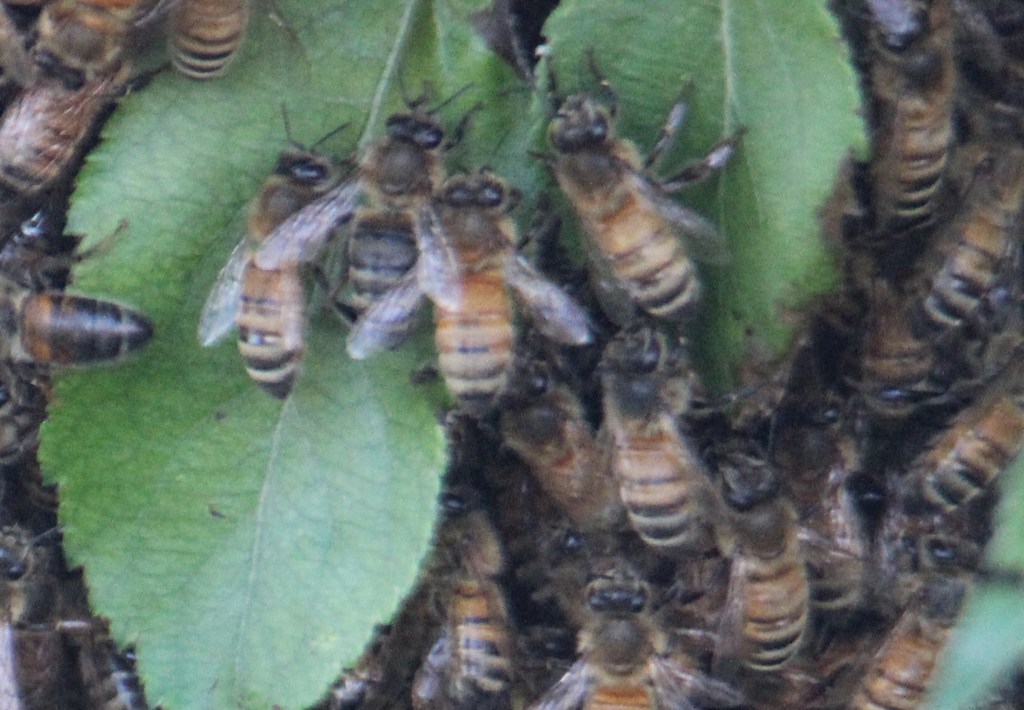 The bees have divided themselves into two groups. This lot are swarming in a tree next to their hive.