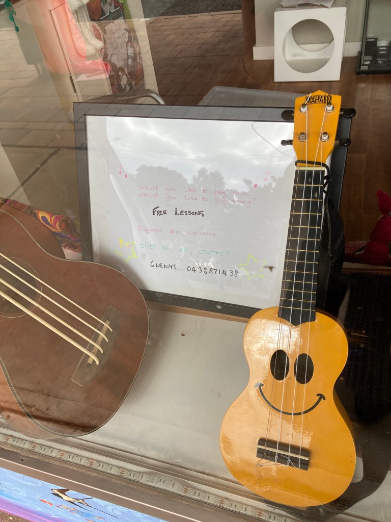 I’m hoping to foster some interest in playing music in my town. So, I put some instruments in the shop window and a sign offering free lessons. This morning I gave my first free lesson to a lady who had an old 4 string banjo. I quickly googled the tuning and tuned it up for her. Sounded amazing! We sat together and she began to remember chords she’d learnt a long time ago. She was so excited about it all, it made my day. She went off to practice. Can’t wait till she returns!