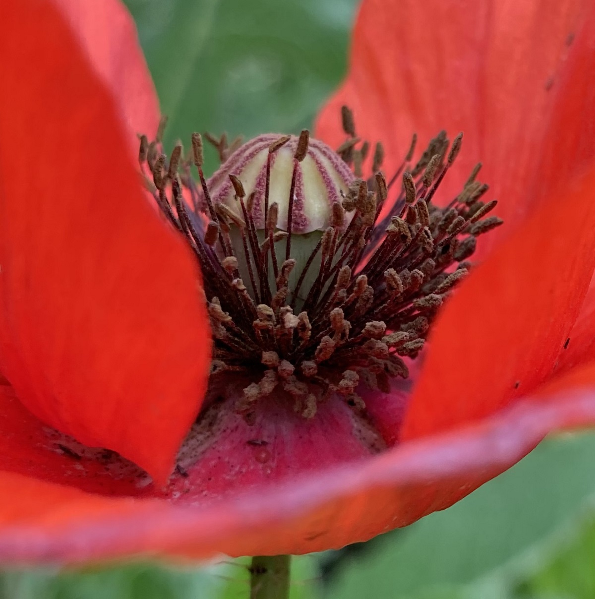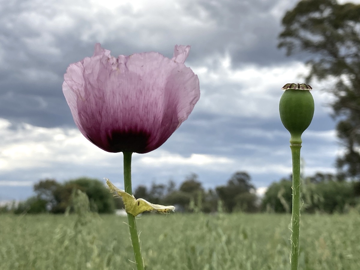 Our neighbour stopped the rather large tractor to call my attention to a single poppy standing tall in the field of oats he was mowing. It was a threatening afternoon, the clouds heavy, rain was forecast and the wind was making it almost impossible to take a photo. The poppy was throwing itself in every direction as the wind caught it.