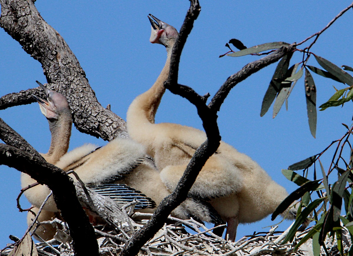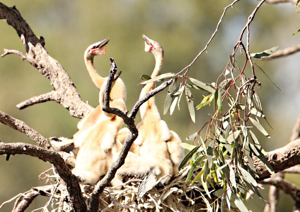I’m following the growth of these Darters in a nest close to my house. They are becoming more adventurous and were out of the nest as I approached. They scrambled back to the nest and were more interested in waiting for mum to return than to bother about me. Mum was sitting on a log watching, and didn’t come by while I was waiting.
