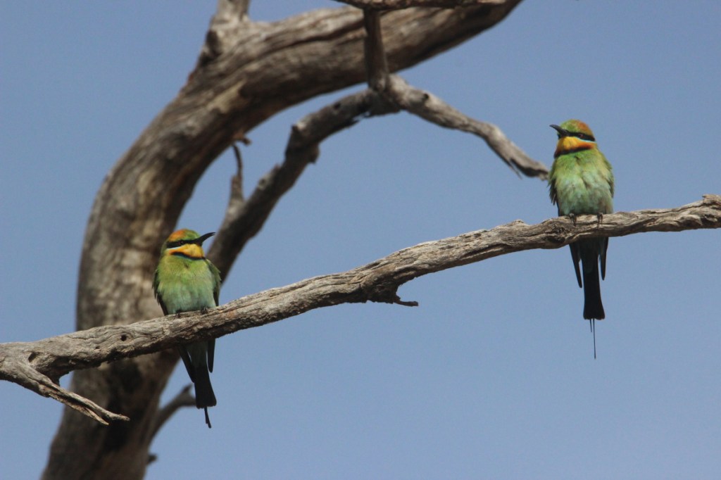 The green colored bee-eater has some friends that appear to be more blue colored. They are very striking.
