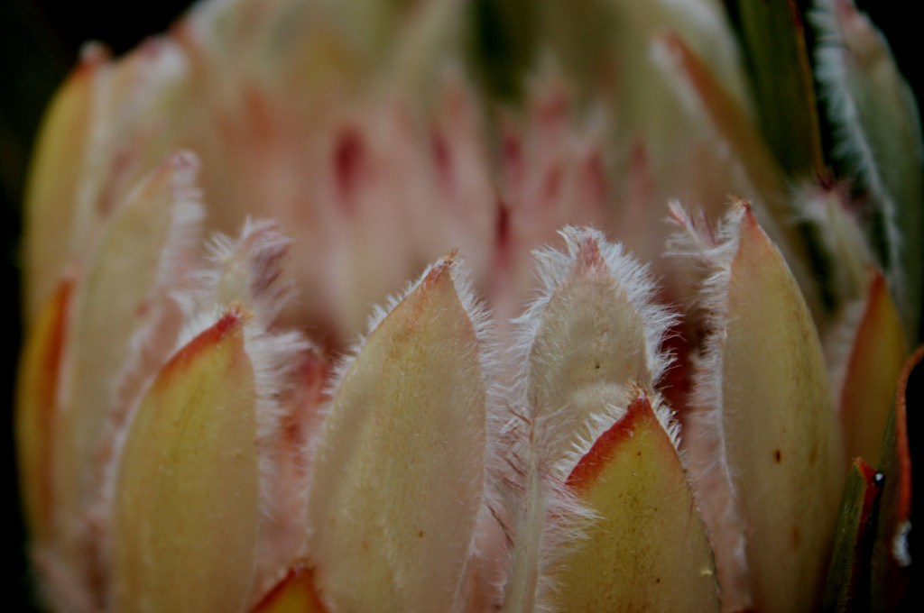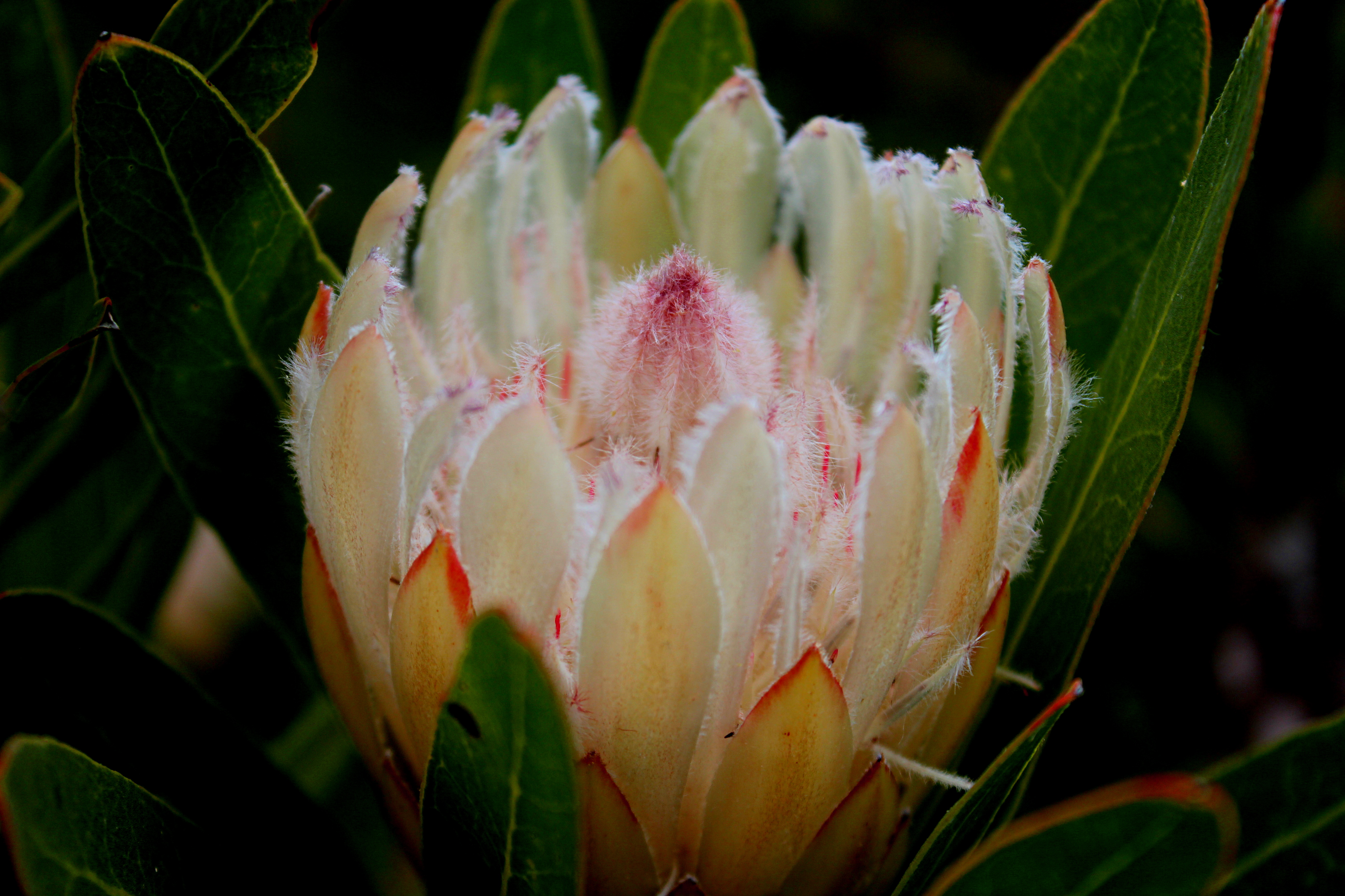 My Protea bush is surviving despite having fallen over a long time ago. The flowers are beautiful. This one is more cream, not the usual pink.