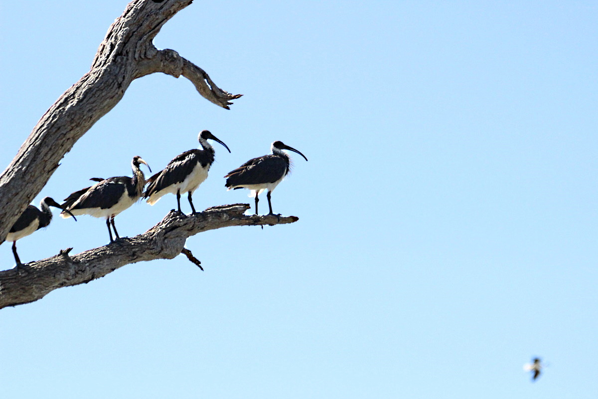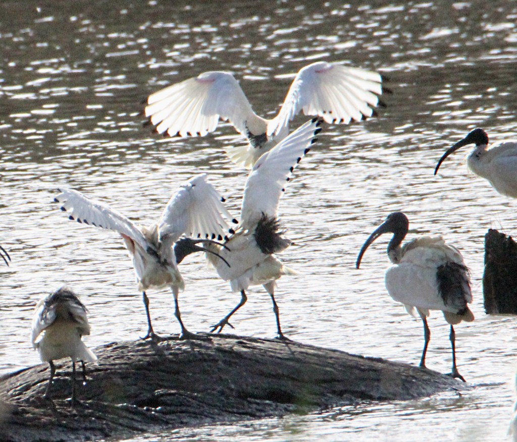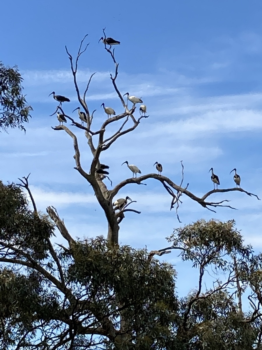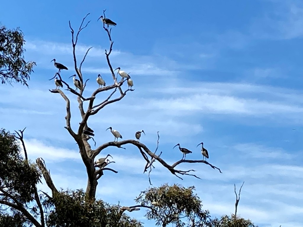 I’ve finally taken the time to look more carefully at what is all around me. I have learnt that there are three types of Ibis in Australia and two appear to be in the picture above. The white ones are just that, White ibis, once known as Sacred ibis and now affectionately known as “bin-chickens”. The darker birds are straw-necked ibis. They have straw like feathers on the front of their necks. The third type, The Glossy Ibis I have yet to see.
